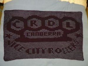 Vice City Roller blanket I made this using purple 8 ply wool and a 4 mm hook. It is filet crochet. The blanket is 130 cm by 80 cm and used 5 and a half balls of wool that are 174 m each. It weighs a bit over half a kilo.